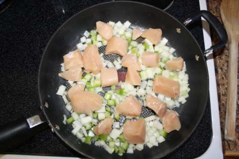 You'll need a large frying pan with a lid. In frying pan on medium heat, melt butter, and add onion and celery. Add chicken.
